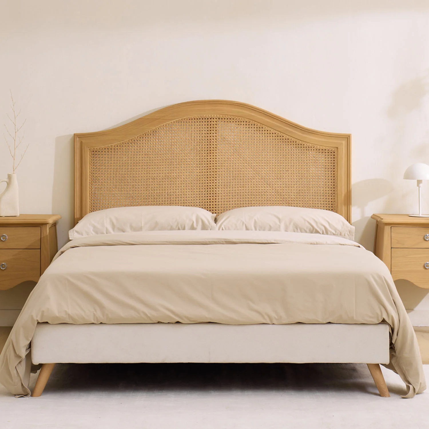 Disponible en todas las medidas, este cabecero se adapta a camas individuales, queen o king size, manteniendo su elegancia y presencia en cualquier formato. Su diseño versátil encaja a la perfección en ambientes de estilo natural, aportando luz y calidez con un toque artesanal único.