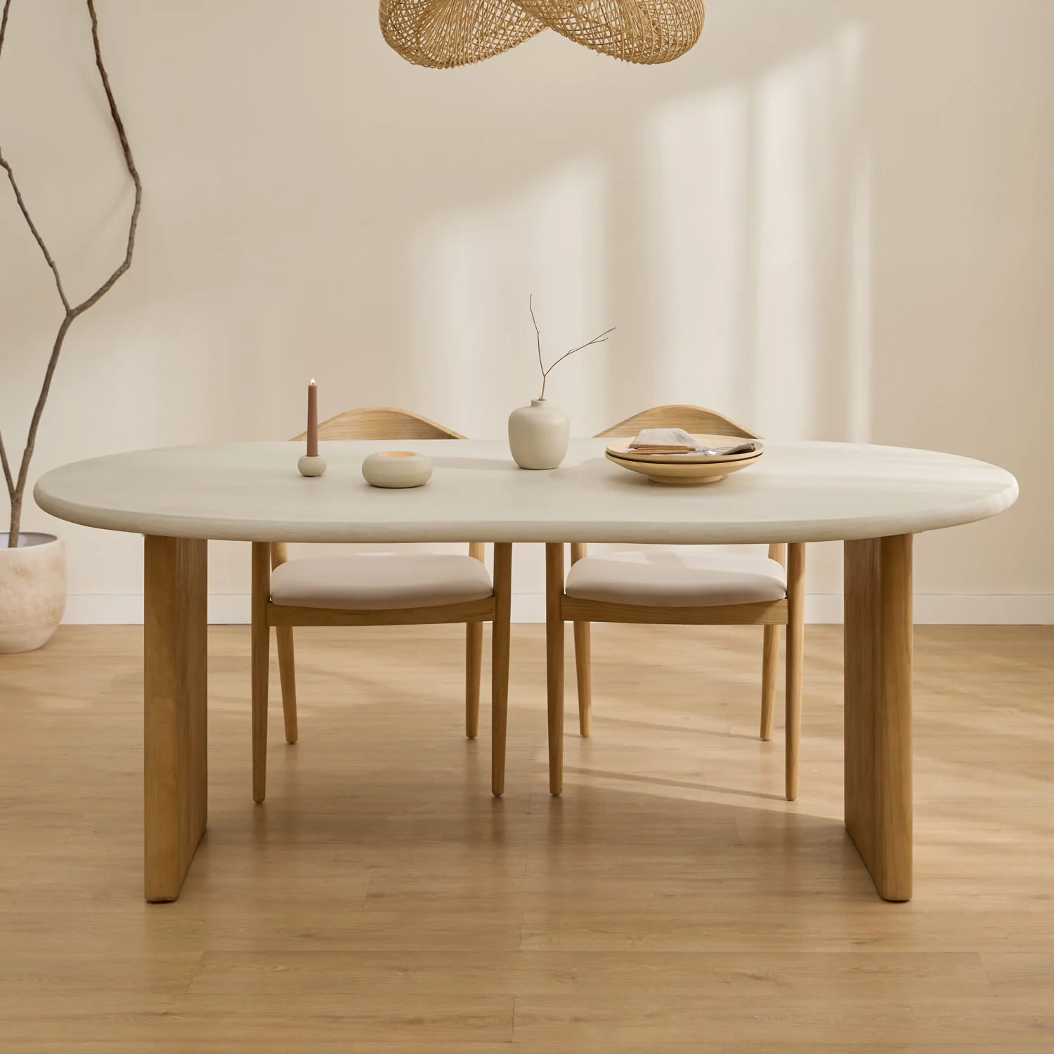 La mesa de comedor Liba combina minimalismo, elegancia y diseño contemporáneo en una pieza. Su sobre de microcemento en tono beige claro ofrece una superficie resistente, elegante y fácil de mantener, mientras que la base de madera maciza de Sungkai aporta calidez, estabilidad y un contraste natural que realza su estética.