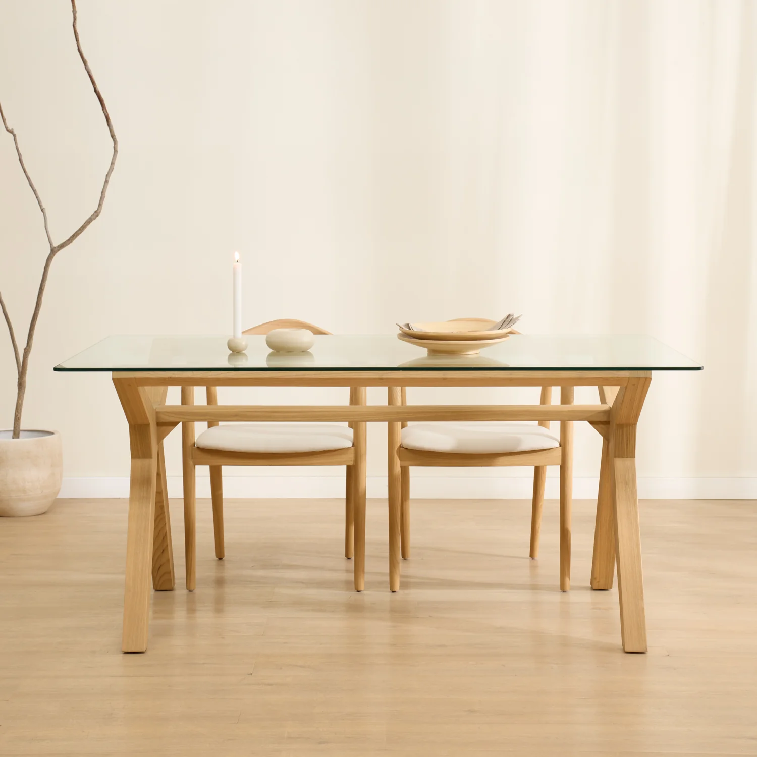 La mesa de comedor de madera maciza Tokei tiene un diseño contemporáneo que permite no sobrecargar la estancia donde se encuentra gracias tanto a su estructura ligera como a la tapa de cristal templado de 1cm. de grosor. Además, la tapa de cristal templado no sólo aporta ligereza visual y luminosidad, sino que también garantiza durabilidad y seguridad. Su acabado pulido permite darle protagonismo a la estructura de madera maciza de Sungkai, convirtiendo la base en un elemento que suma carácter y diseño al comedor.