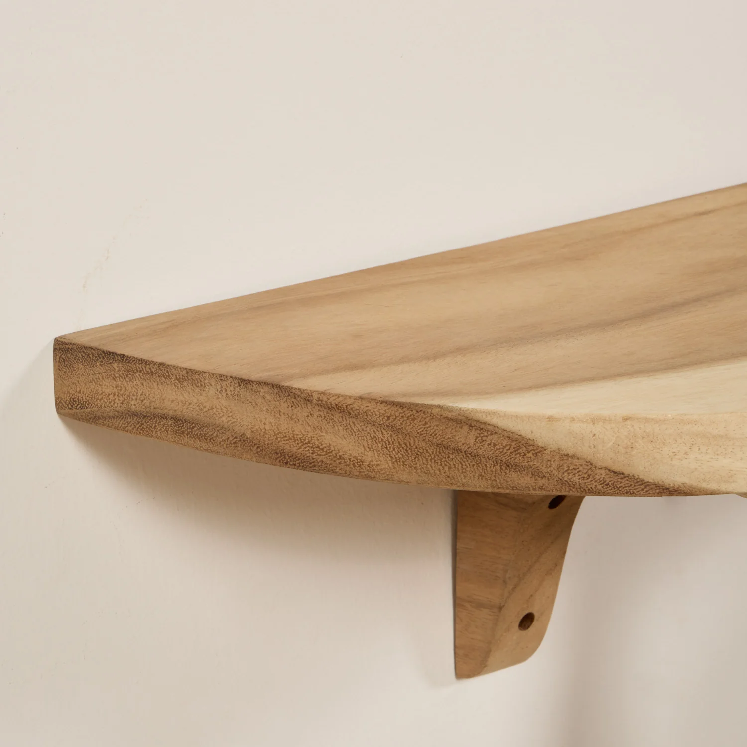 Nuestro estante Rang es super versátil. Úsalo como mesita de noche de pared y consigue un dormitorio cálido y natural. Elaborado en madera natural de Trembesí. Incluye sistema de anclajes.