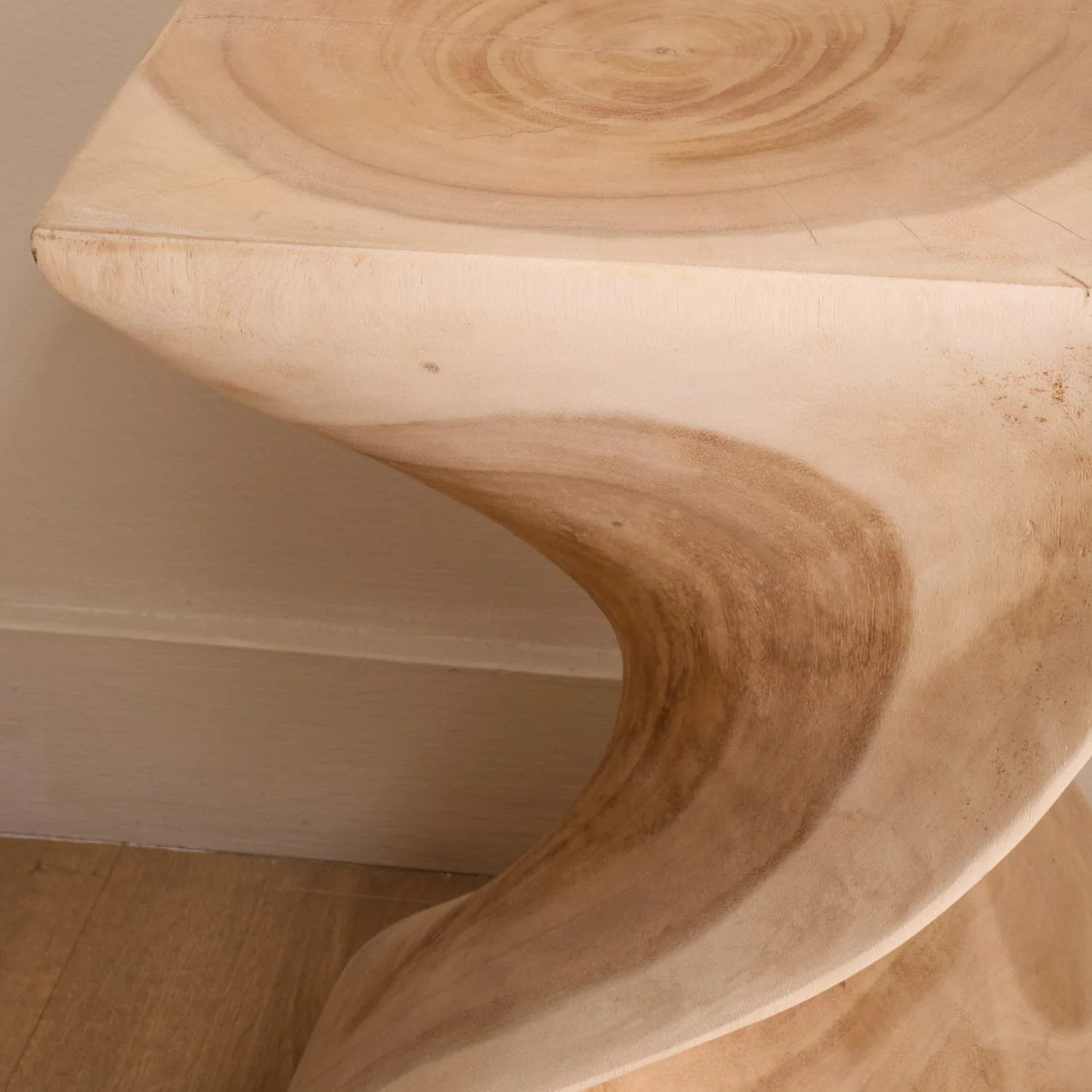 Gracias a su construcción robusta y su forma geométrica, también puede utilizarse como mesa auxiliar o como taburete ocasional, aportando funcionalidad extra sin renunciar al diseño. La textura y el tono de la madera de Trembesí refuerzan su carácter artesanal, haciendo que cada mesita sea única.