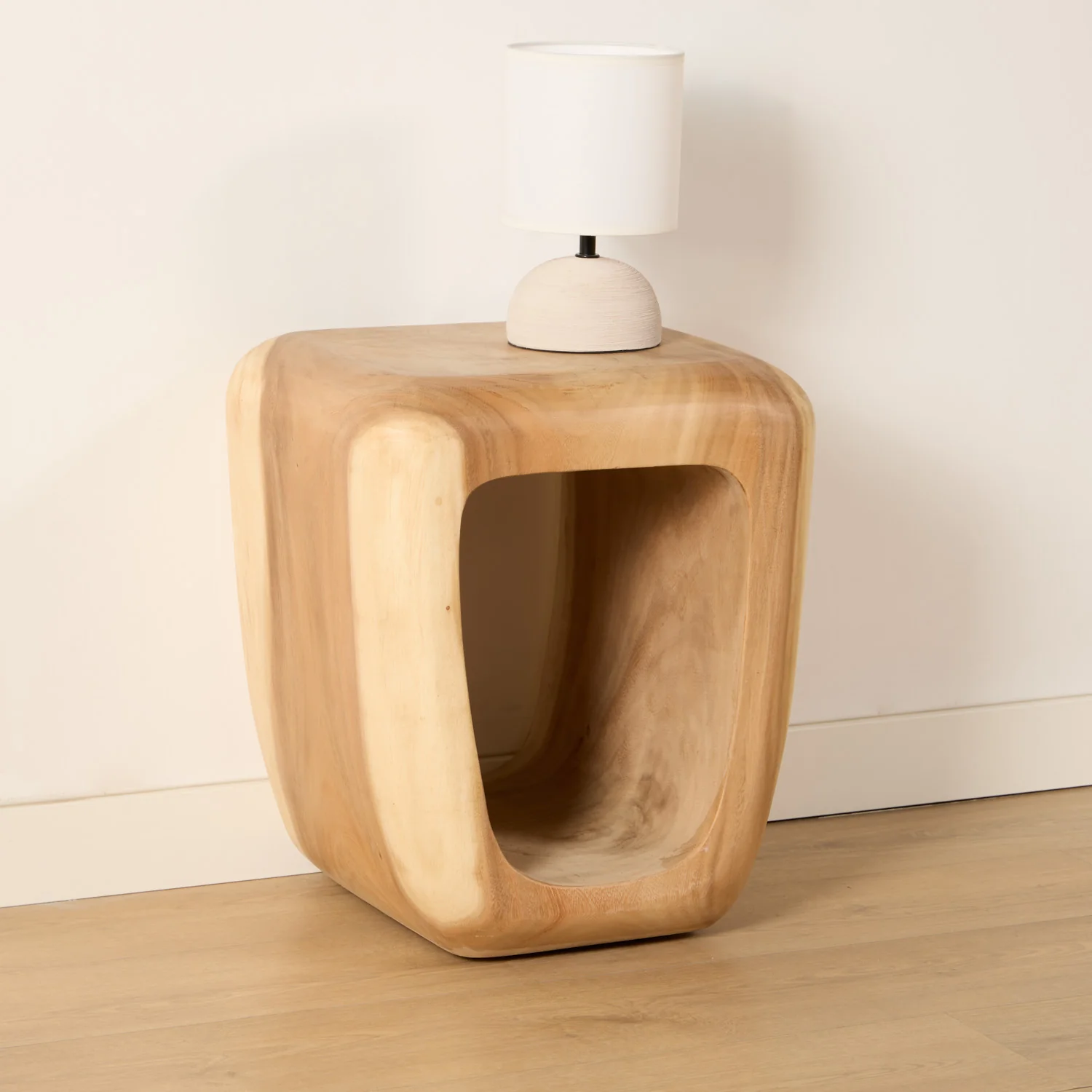 El pack de 2 mesitas de noche Nila es la opción ideal para quienes buscan equilibrio, simetría y un toque de diseño orgánico en el dormitorio. Con sus formas redondeadas y suaves, estas piezas esculpidas en madera maciza de Trembesí destacan por su carácter único: cada unidad presenta vetas y tonalidades distintas, propias de un material natural y auténtico.
