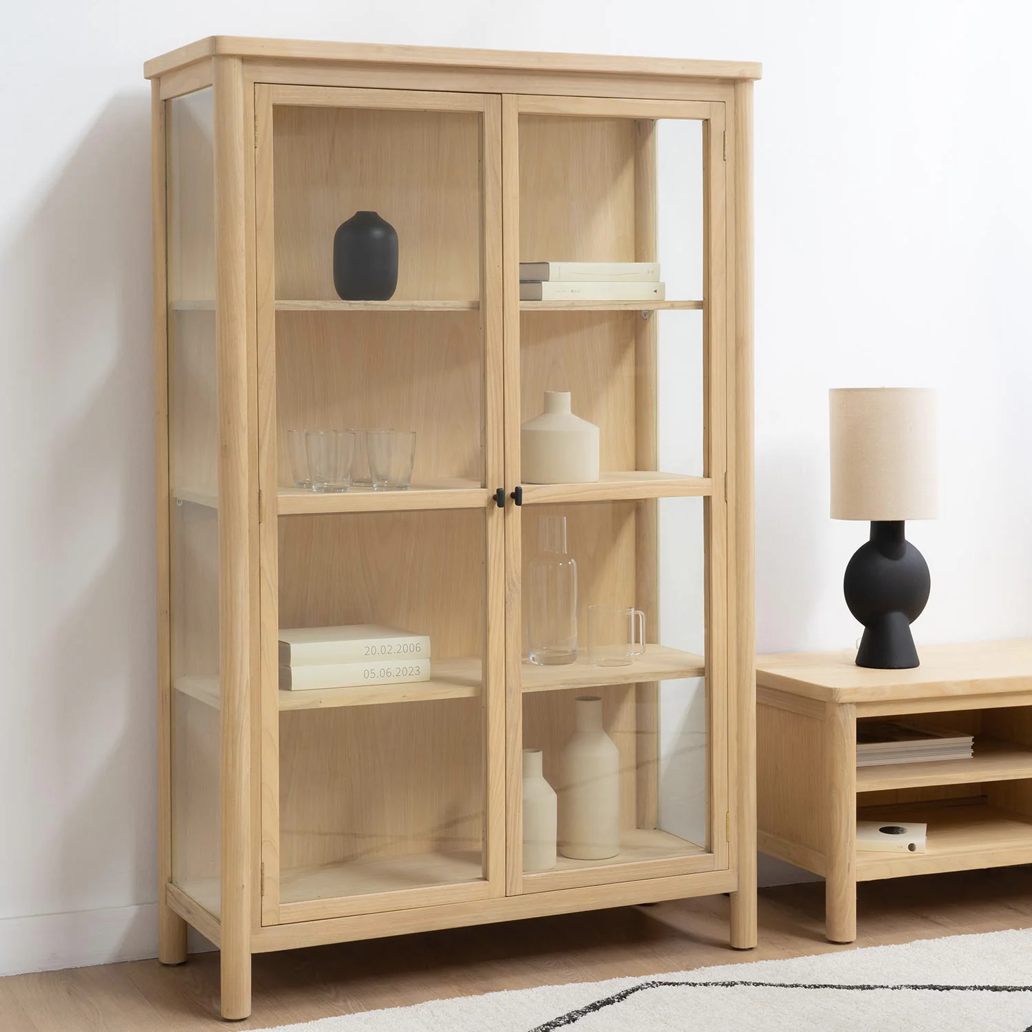 La vitrina Dane está elaborada con madera de Sungkai. Sus puertas de cristal darán sensación de amplitud al comedor. Sus pomos son de hierro color negro. Descubre el resto de la colección Dane.
